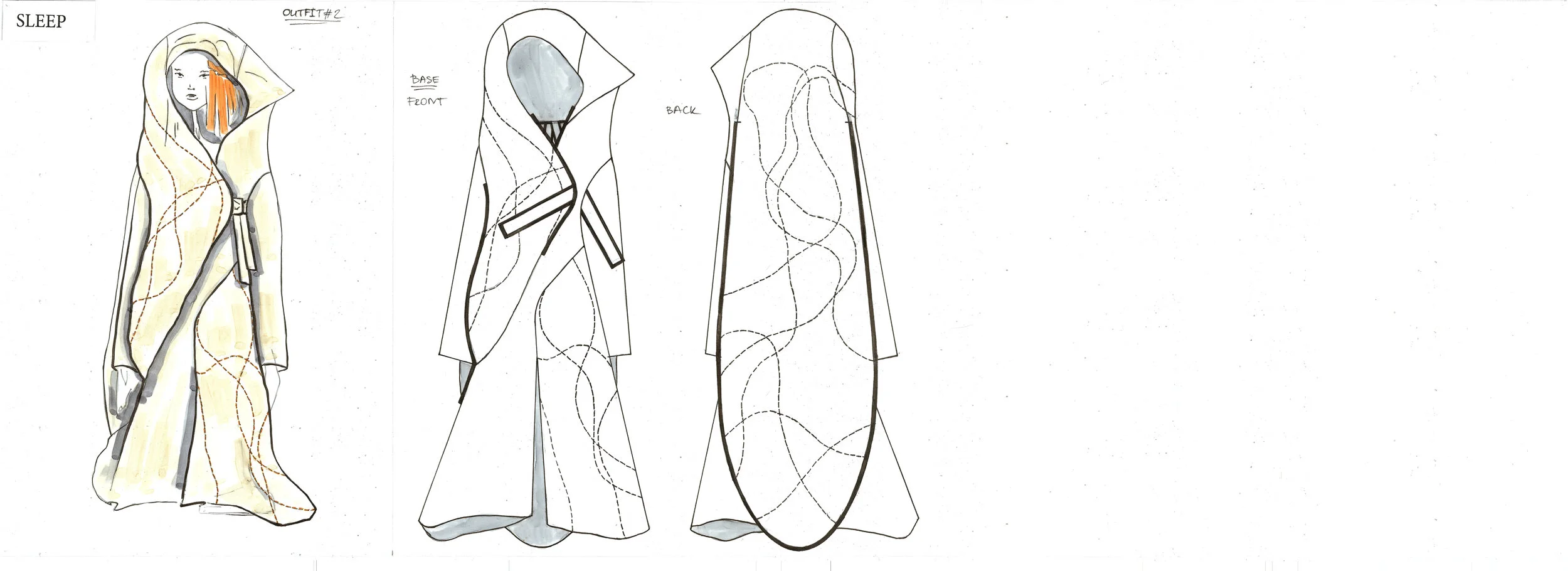 My personal research was thoroughly focused on the Migration scenario in our collection, since I was responsible for the Migration add-ons’ development. So, for my personal vision and for the 6 other outfits, I had decided to continue developing the Migration scenario further. I broke down the migration line-up under three categories. Following the Maslow’s Hierarchy of Needs, my looks responded to the psychological & belonging needs of humanity: family, carrying food (doing groceries in the future), sleep.